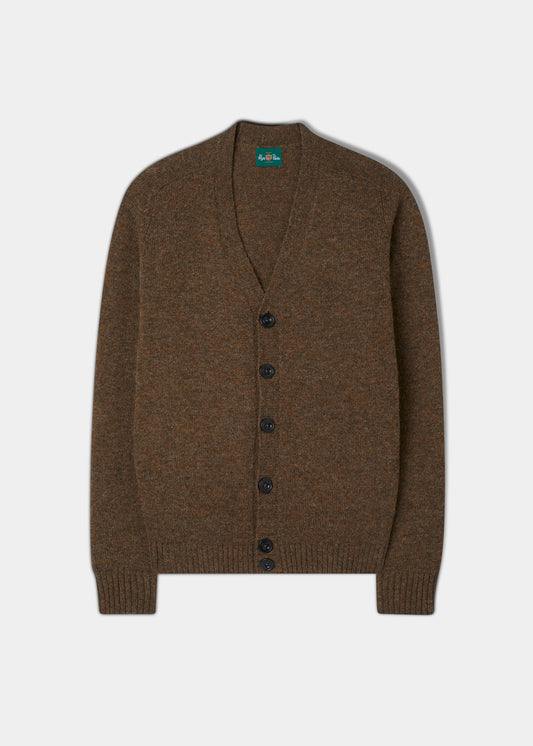 Cardigan da uomo in lana Shetland color pino silvestre.