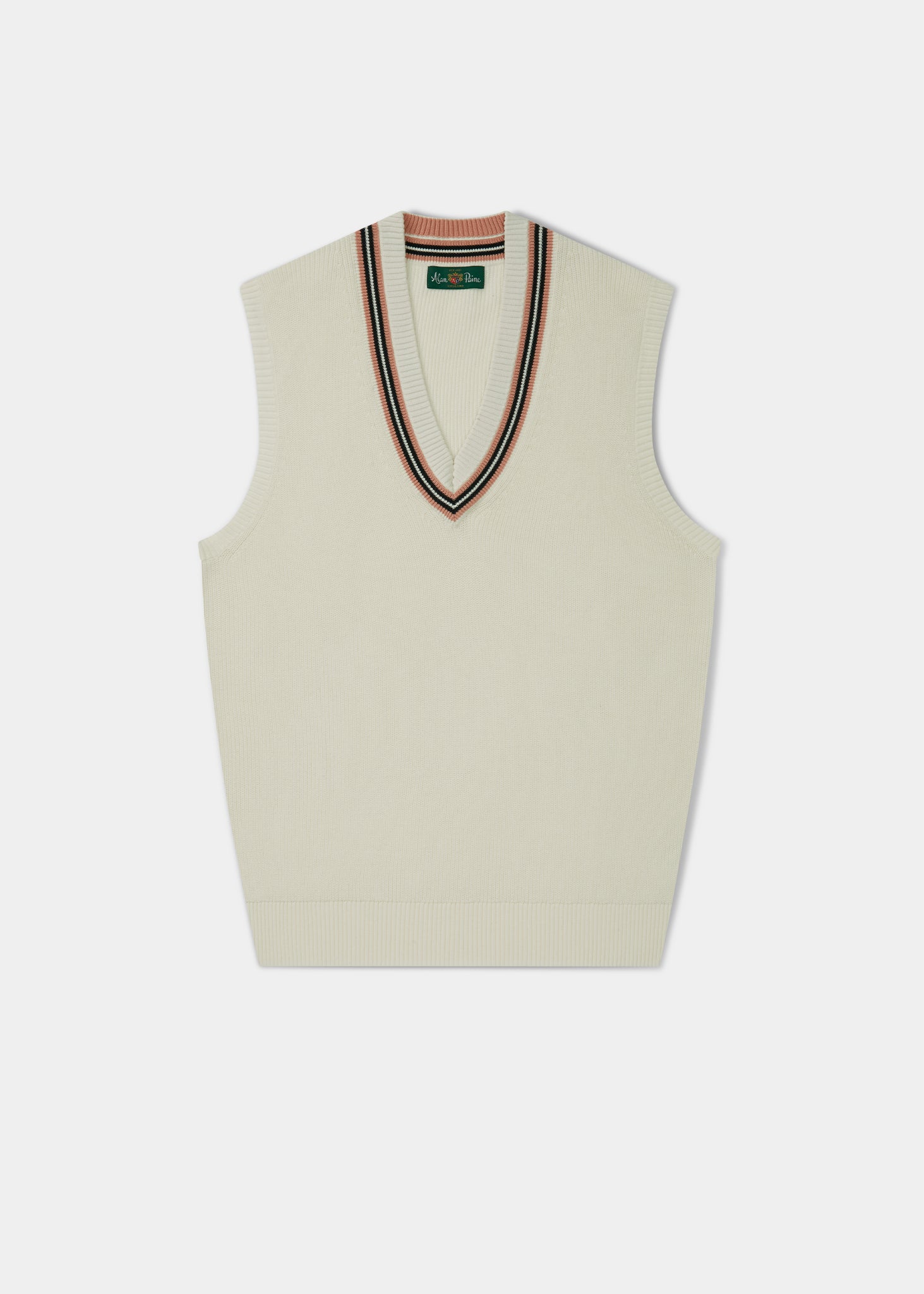 The Cricket Jumper has been a staple of Alan Paine for decades, offered in a variety of colours and materials over the years. This year we are introducing the Ladies Cricket Slipover In Ecru with a Dusk Pink and Dark Navy trim. This magnificent version of the Cricket vest is made from High Twist Cotton. The Cable Knit has been swapped out for a Half Cardigan stitch giving it a new look and feel.