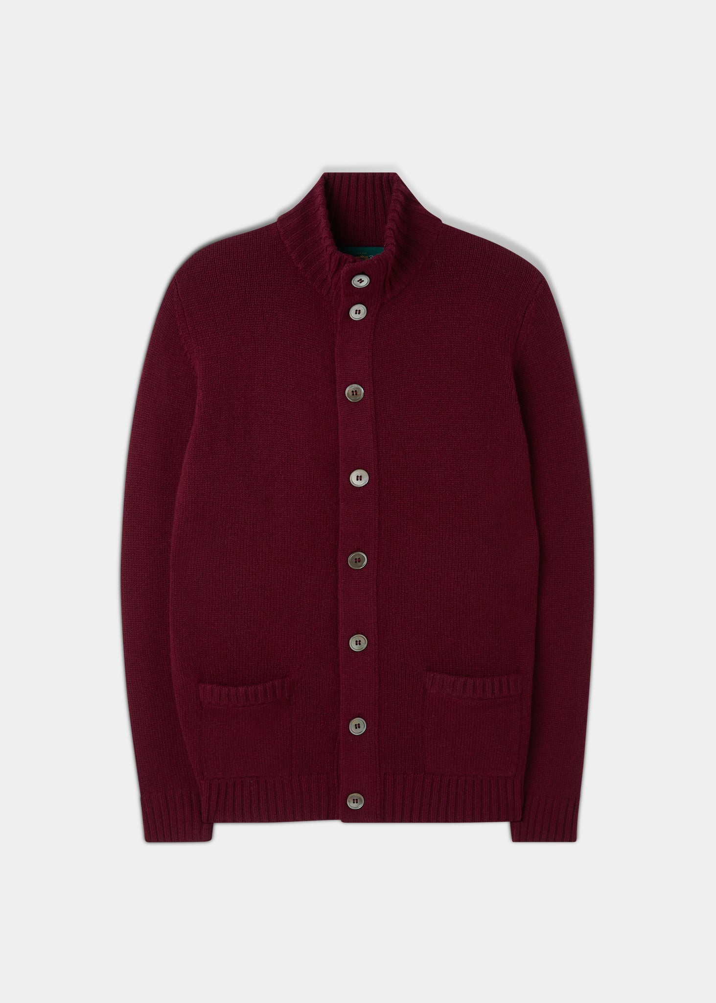 Versatile senza sforzo, questo cardigan a collo alto in pura lana d'agnello Bordeaux è perfetto sopra una camicia o una semplice t-shirt. Il colletto rialzato a coste, i polsini, l'orlo e il dettaglio a coste sulle tasche conferiscono a questo classico un tocco contemporaneo.