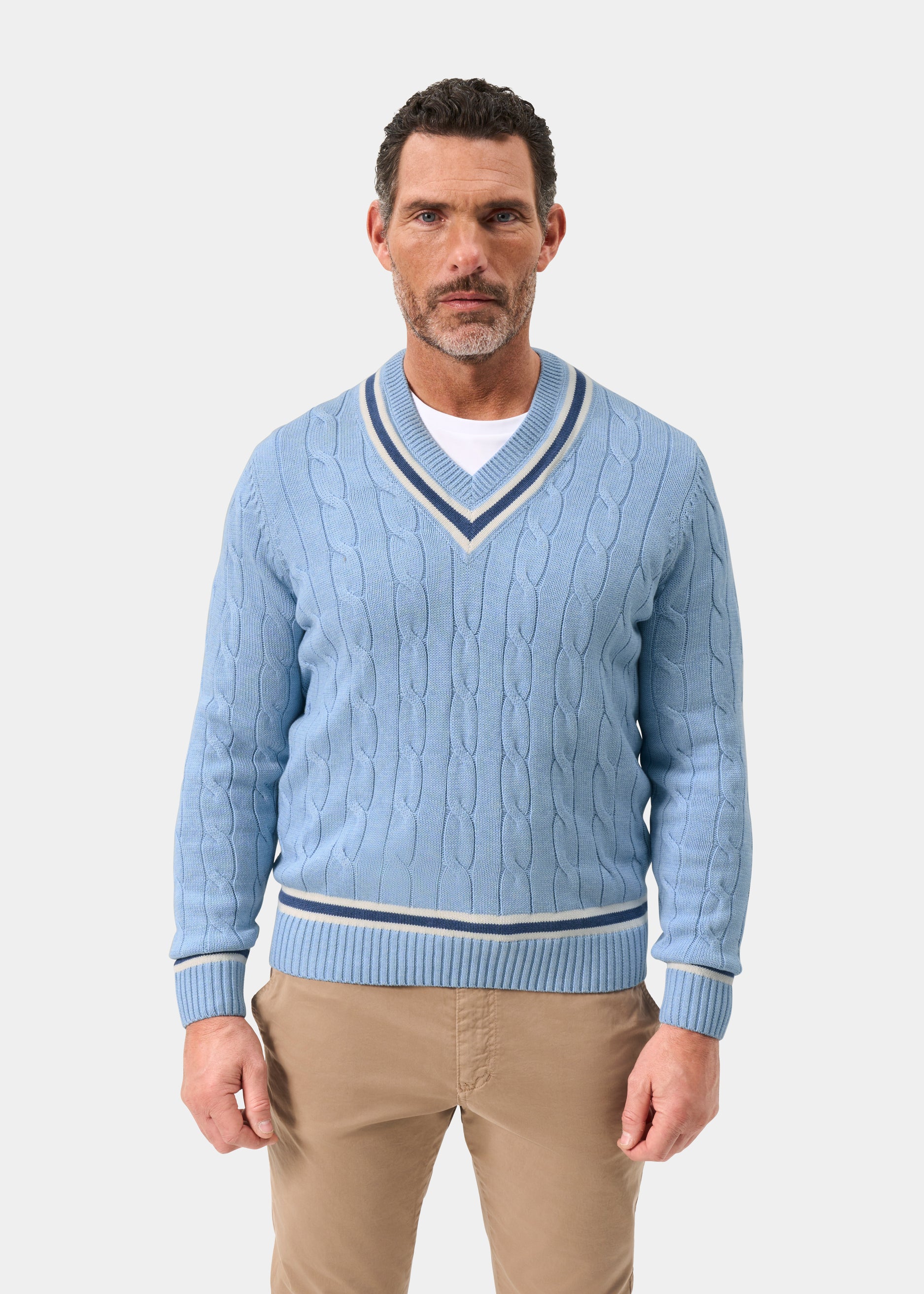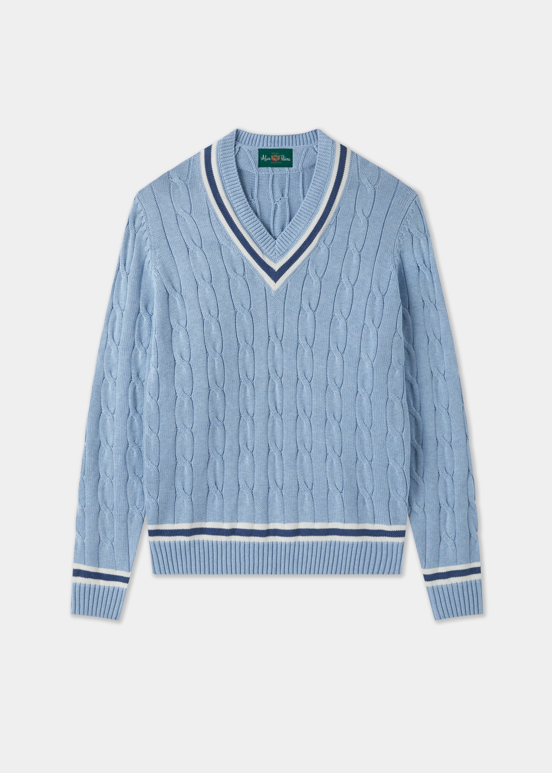 Sandridge Cable Knit Cricket Jumper In Steel Blue and Ecru