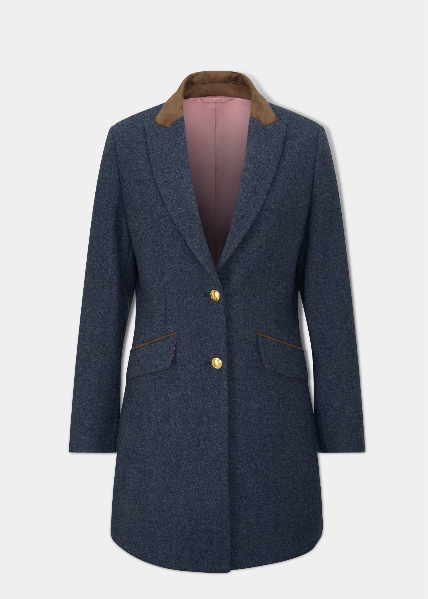 Falling to mid-thigh in a flattering, tailored shape, this new season elegant coat in Blue is crafted in a specially selected, contemporary-coloured medium weight pure wool tweed. Featuring a water repellent outer, contrast faux suede top collar and pocket trims and a beautiful paisley lining, this versatile coat will work equally well paired with smart jeans or the complementary skirt. Ideal for country gatherings or simply a walk in the countryside.